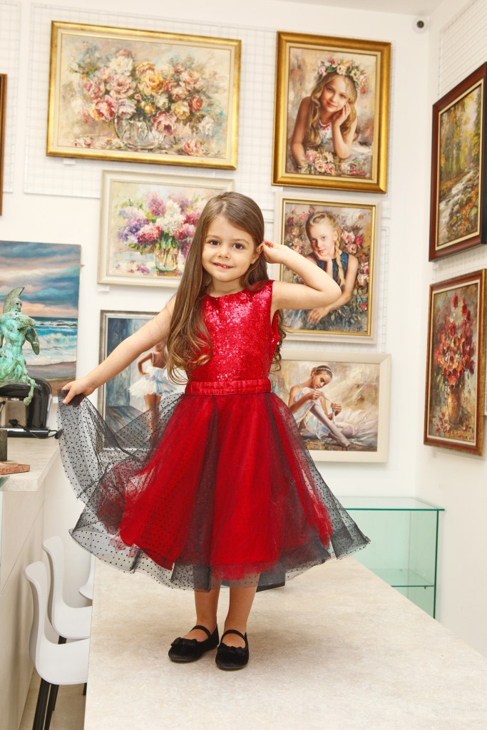 Тя дефилираше облечена с боди от червени пайети, а върху него беше с пола с червен и черен тюл на точици.