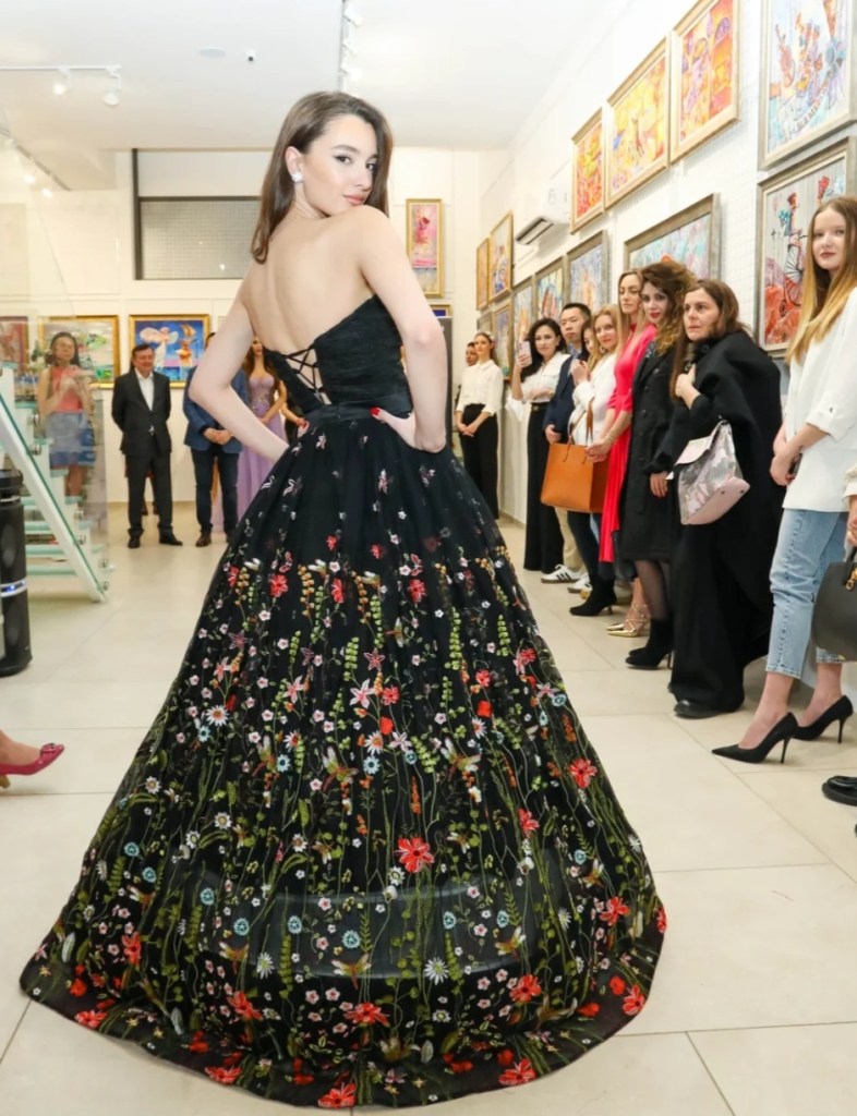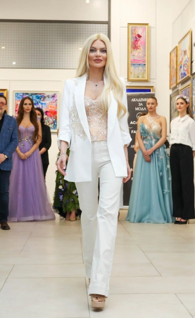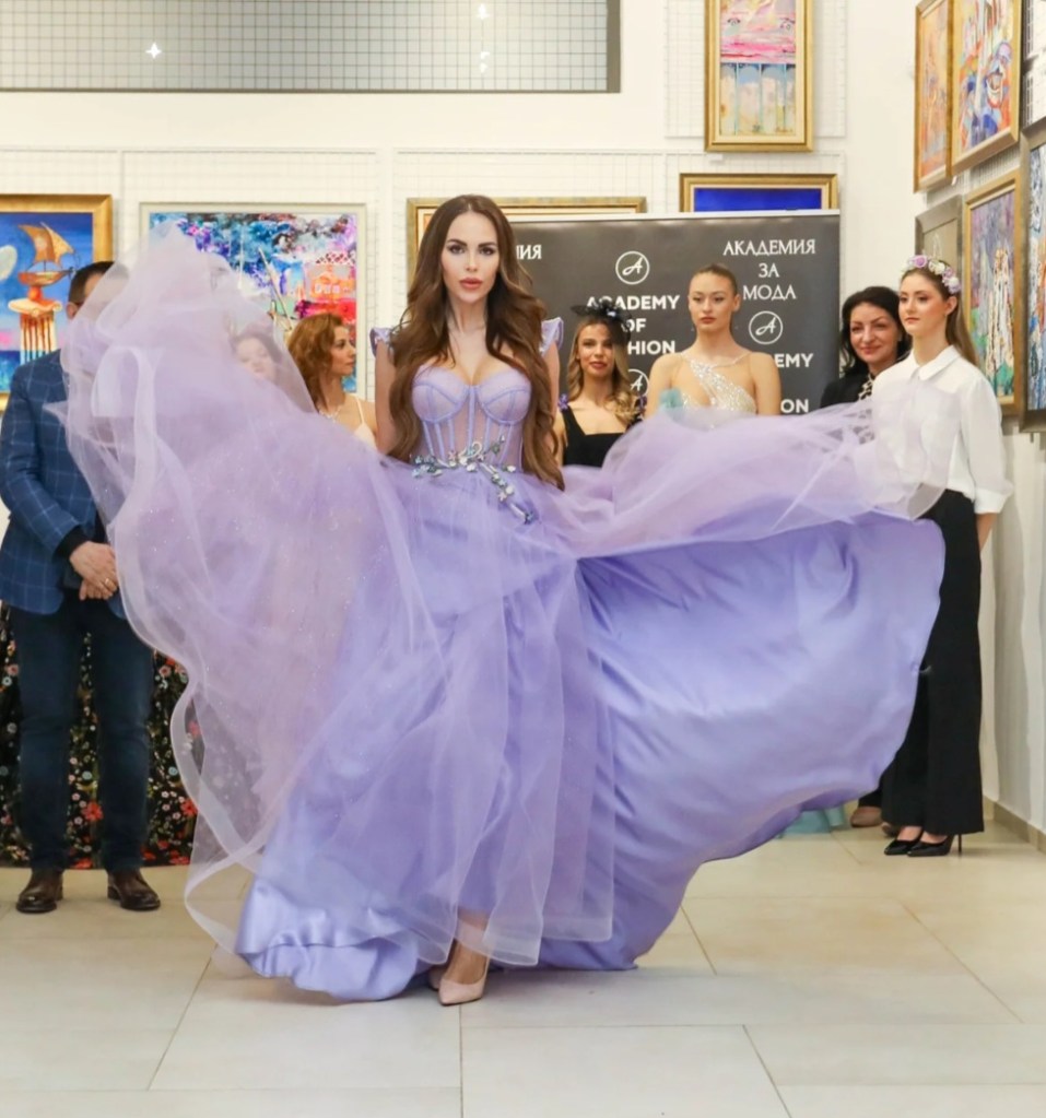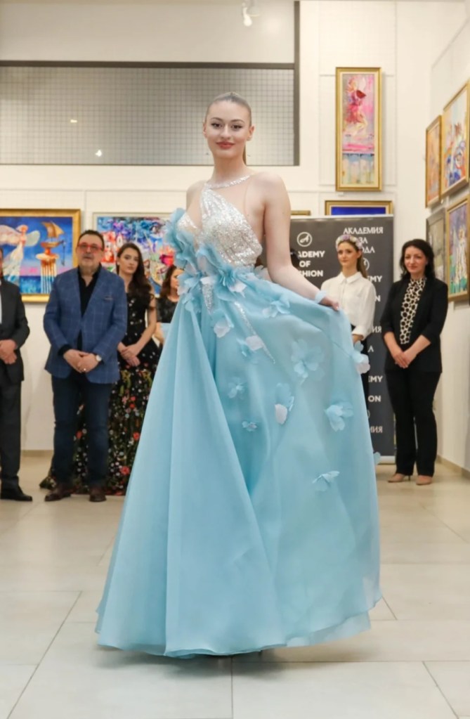 Поля Кинова – носител на „Златна игла“ и дизайнер на модна къща Paloma Fashion, представи рокля от копринена органза, която възхвалява сложните форми на цветята. С всяко грациозно движение тоалетът разкрива симфония от блясък и искрящи елементи.