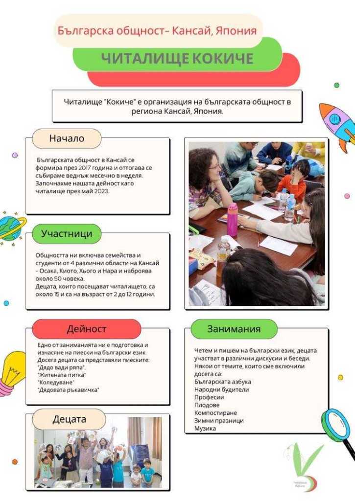 В резултат на високата посещаемост, през март 2024 г. се стигна до официална регистрация на първото българско образователно дружество в Япония – читалище „Кокиче“.