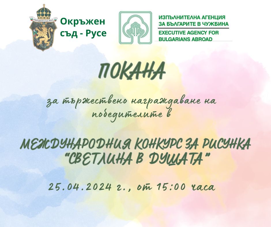 Двете институцуии – Окръжен съд – Русе и Изпълнителна агенция за българите в чужбина отправят покана към всички участвали в конкурса деца, работещите в съдебната палата и медиите на 25.04.2024 г. от 15:00 часа в централното фоайе на Съдебната палата на тържествено награждаване на авторите на отличените творби в Международния конкурс за рисунка „Светлина в душата“.