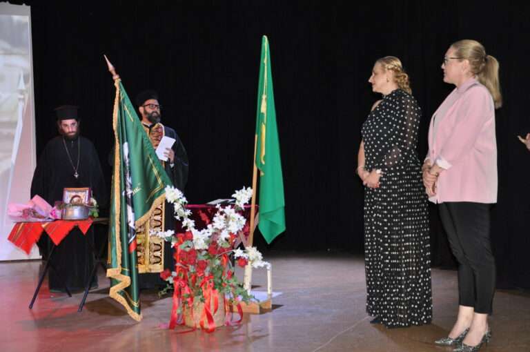 В официалната част на празника беше представено и първото знаме на училището , което беше осветено Архимандрит Епифаниос и от отец Станислав Симеонов в кратка, но много вълнуваща церемония на български и гръцки език, по време на която цялата зала пееше божествените химни заедно със свещениците.