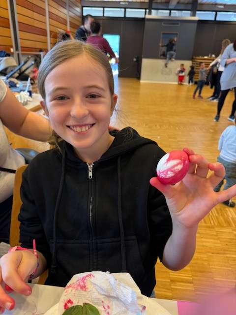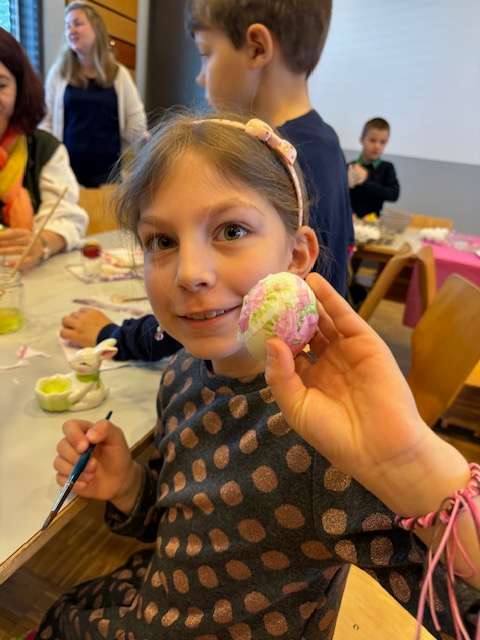 Това е едно от любимите занимания за малки и големи по време на великденските празници и се превръща в повод да развихрим креативната си страна и да прекараме време с любимите си хора, докато пазим традициите. На ателието бяха дошли семейства и от Женева, Берн и Цюрих. Над 30 деца с интерес пробваха различни техники на боядисване на яйцата. По традиция, всяко първо боядисано яйце бе червено и бе боядисано от най-възрастната жена. Тази година това бе баба Раиса на 68 години. Тя с любов направи кръстчета с първото червено яйце върху челцата на децата за здраве, щастие и берекет в семейството.