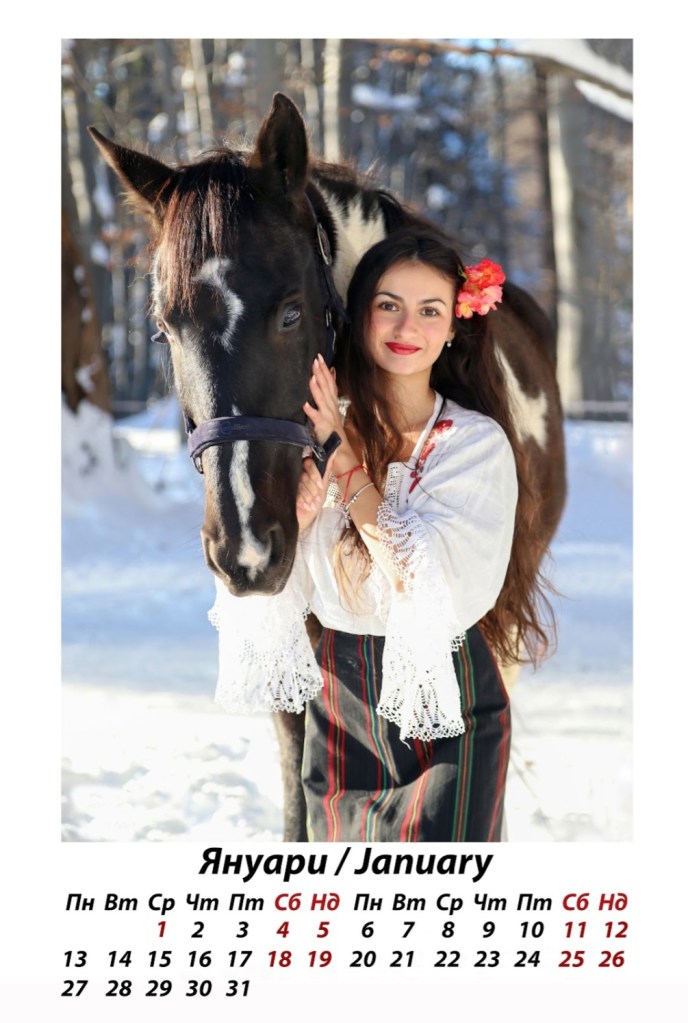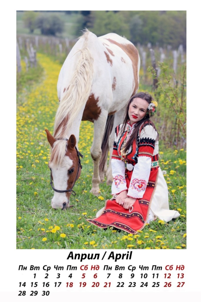 „Месец април е с разкошната Рая. Колко обичам да снимам Рая! Тя е танцьорка в ПТС „Зора“, гр. Дупница (още един прекрасен български ансамбъл, който обожавам да гледам и снимам), и връзката й с фолклора е не просто любов, а начин на живот, връзка с изконното българско начало. Снимката е част от една пролетна фотосесия с коне, която отново беше в любимото Ранчо Буч. Ако търсите място, в което да се слеете с природата и междувременно да се насладите на прекрасната компания от четириноги приятели, то Ранчо Буч е вашето място. 🙂 Рая и Земфис – красива комбинация – обич от първа прегръдка! ♥