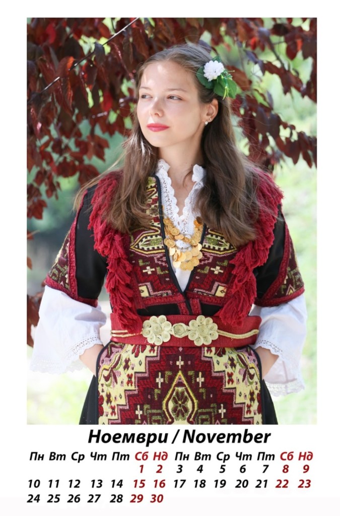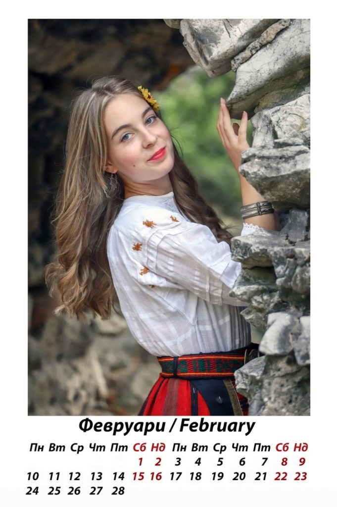 „Месец февруари, Ливия, е едно прекрасно създание – българка, която живее в Гърция. Тя за първи път облече българска носия за тази фотосесия, подарък за нея и майка й от обща наша приятелка – Росица. Роси, благодаря ти, че за пореден път ме свързваш с разкошни хора, които носят корена български в сърцата и душите си! Ливи се оказа прелестен модел, чиято неподправвена красота чудесно кореспондираше и с камерата, и с автентичността на носията.“