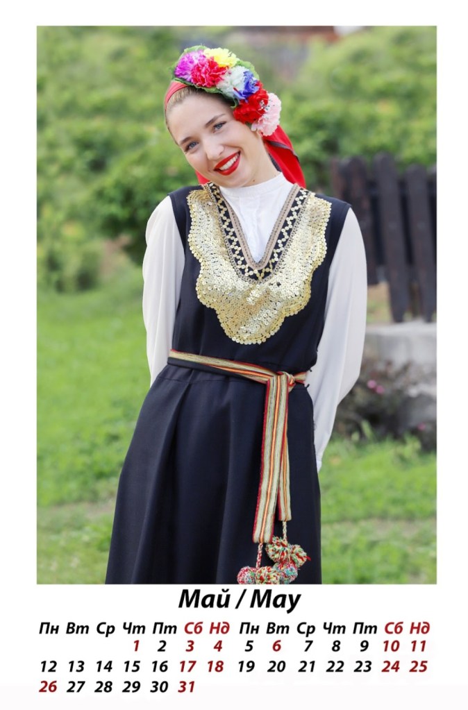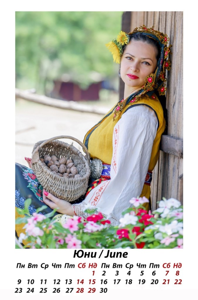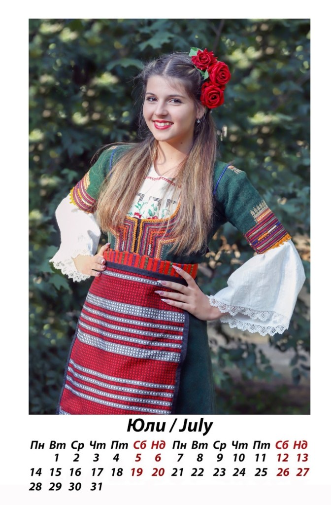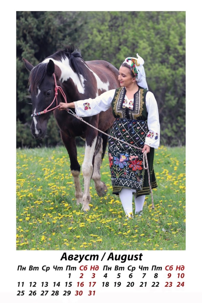 „Месец август, чаровната Иринка, е танцьорка в Студентски фолклорен ансамбъл при ЮЗУ „Неофит Рилски“ – още един прекрасен български ансамбъл с традиции и сценично присъствие, който не щади знания и усилия в популяризирането на българския фолклор. Освен талантлива танцьорка, Иринка колекционира автентични носии, които гордо показва при различни участия във фестивали и събори. Този слънчев кадър също е направен в любимото Ранчо Буч и отново с красавеца Кебранто, който обожава да се снима с хубави девойки.“