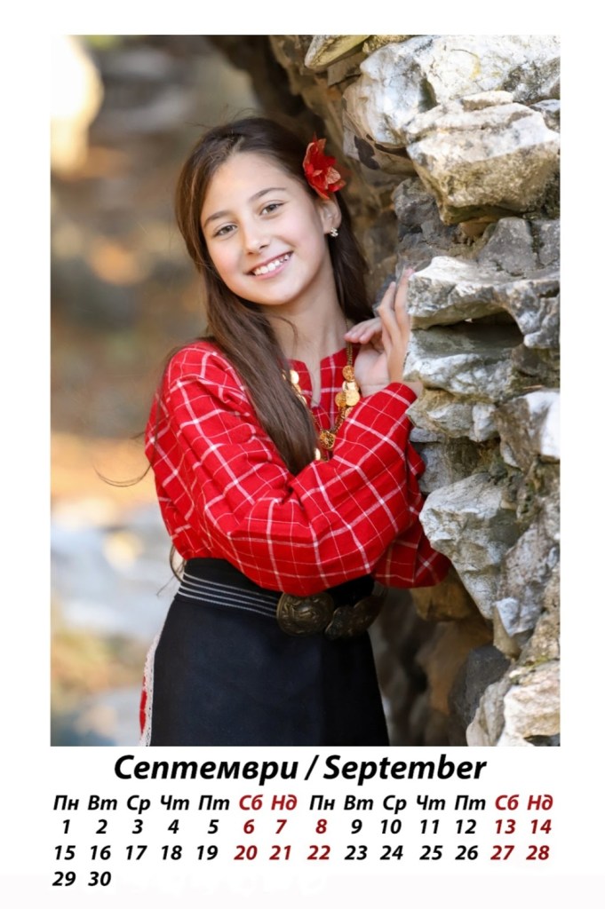 Михаела или „моето Мише“, както обичам да й казвам, краси страницата на месец септември. Мишето е най-малкият участник в календара, но нейната чаровна усмивка и щастието, което излъчва в този есенен кадър, правят присъствието й незаменимо. Тя винаги и с удоволствие се включва в различни мои творчески хрумки и резултатът винаги е любов. ♥“