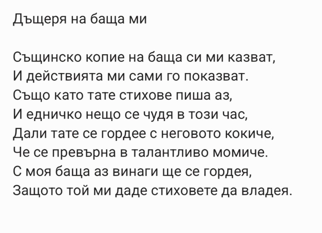 Днес ви представям моето произведение „Дъщеря на баща ми“. Това е първото от много стихотворения, които искам да споделя с вас.