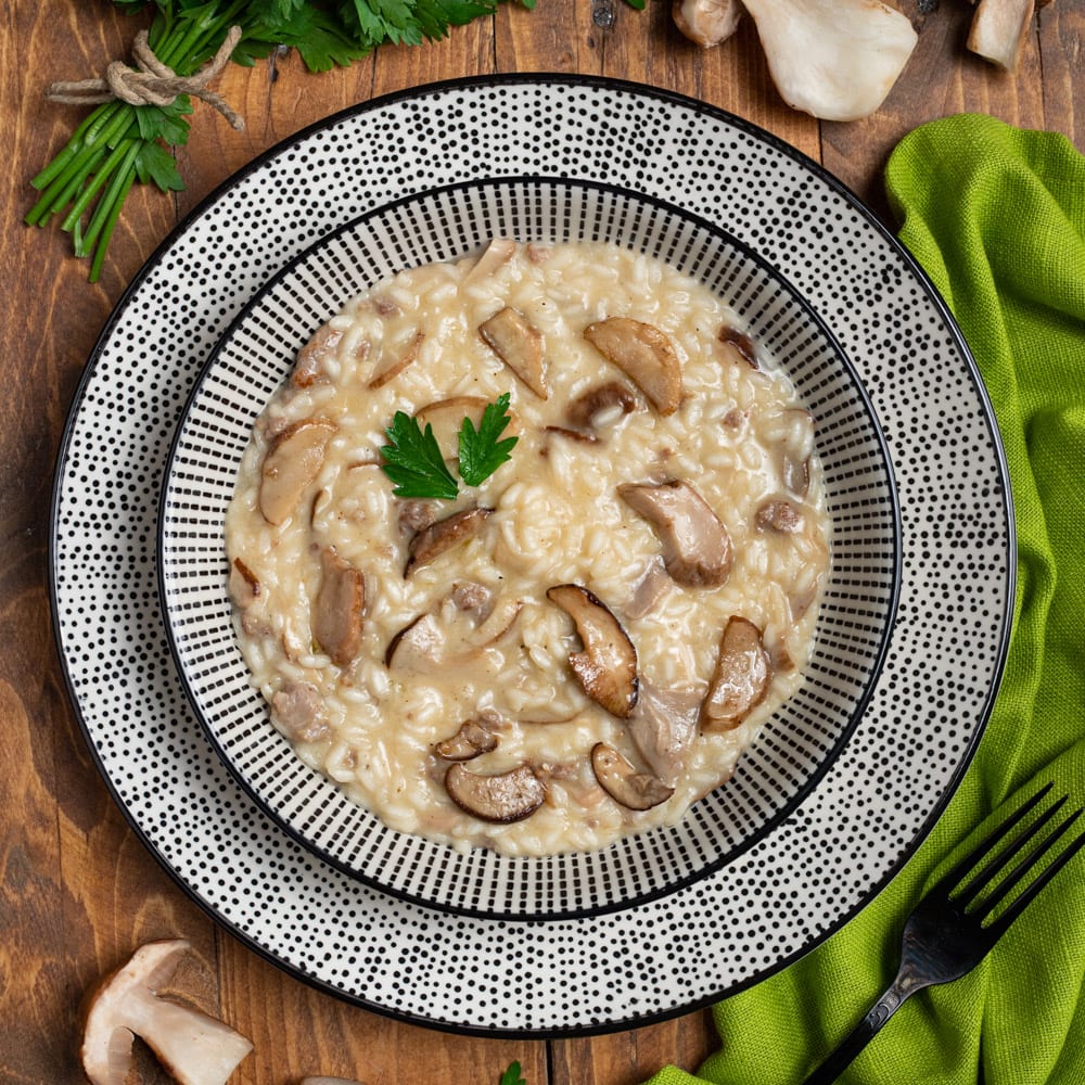 Няма есен без ризото с гъби, с неговия обгръщащ вкус и топли цветове, които напомнят типичната сезонна зеленина. Ризотото с гъби и наденица е още по-апетитен вариант, който черпи вдъхновение от класическото домашно ризото с наденица, като подобрява всички вкусове.
