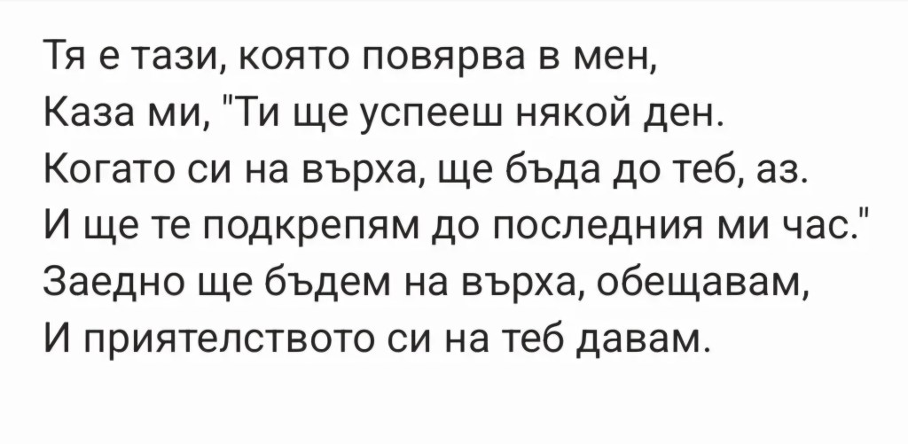 С огромна признателност искаме да и благодарим за това, че с много обич и приятелско чувство написа едно специално стихотворение, посветено на вдъхновението и подкрепата между хората в нашия сайт. В него тя е събрала силата, надеждата и искрената подкрепа, които винаги носим в себе си!