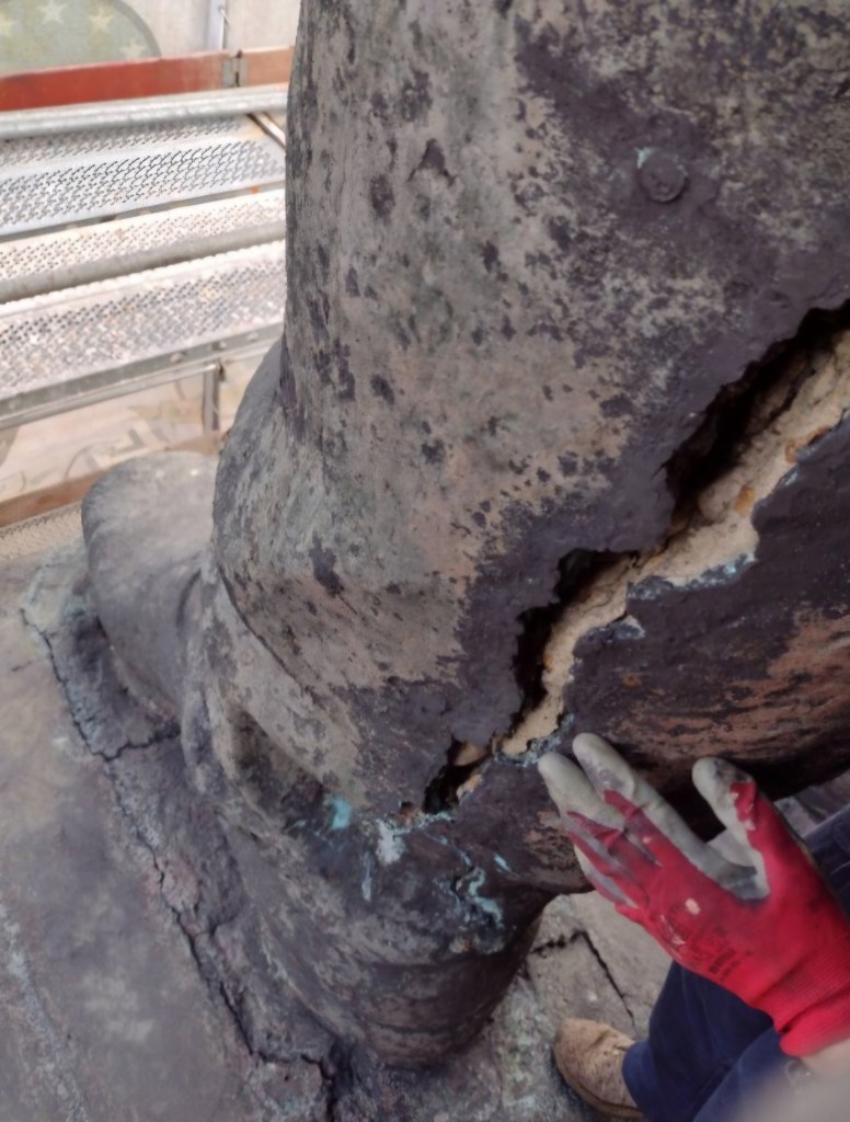 Малцина знаят, че колосалните фигури – тези бронзови войници, майки и деца – не са били кухи и леки, както изглеждаха отстрани. В краката им е имало бетон, използван при издигането за стабилност и тежест. Десетилетия наред влагата е прониквала в този бетон, замръзвала е през зимата, разширявала се е и отново се е топяла. В резултат вътрешното налягане е напукало фигурите до степен, че в процепите можеше да влезе цяла човешка длан. Тези, които сме се качвали горе, сме го виждали – пукнатини, през които спокойно можеш да прокараш ръката си.