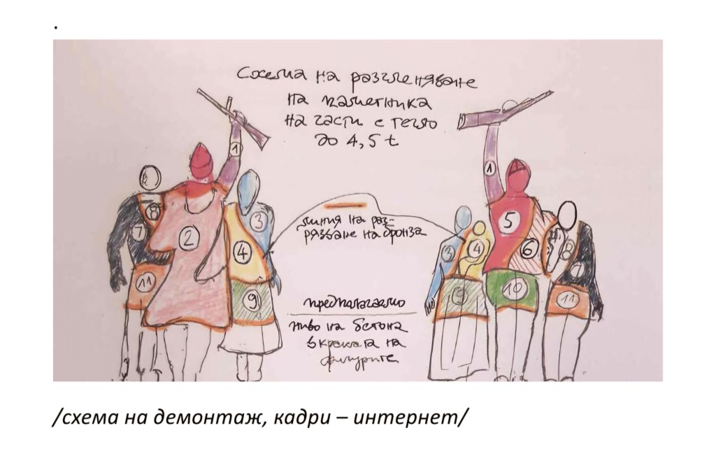 Първо бяха премахнати високите и обемни детайли от скулптурните групи: „Шпагин“-ът на солдата, плаща му, после самите фигури на войниците. Работата се извършваше по план – част по част, според начина на първоначалното съединяване. Всеки елемент бе отделян внимателно, за да не се срути неконтролируемо. Фигурите бяха сваляни с кранове и извозвани за съхранение в база край София.