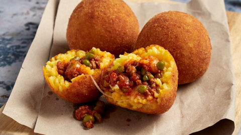 Днес ви представяме двете най-класически вариации на аранчини: с месен сос и грах и с шунка и моцарела.
