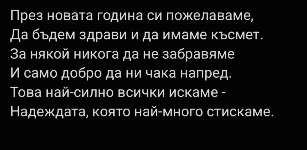 Затова искам да ви потопя в най-новото си стихотворение „Надеждата, която ни крепи“, което е посветено на всички вас, защото тази година за всички беше тежка и се надяваме догодина да бъде много по-добра!