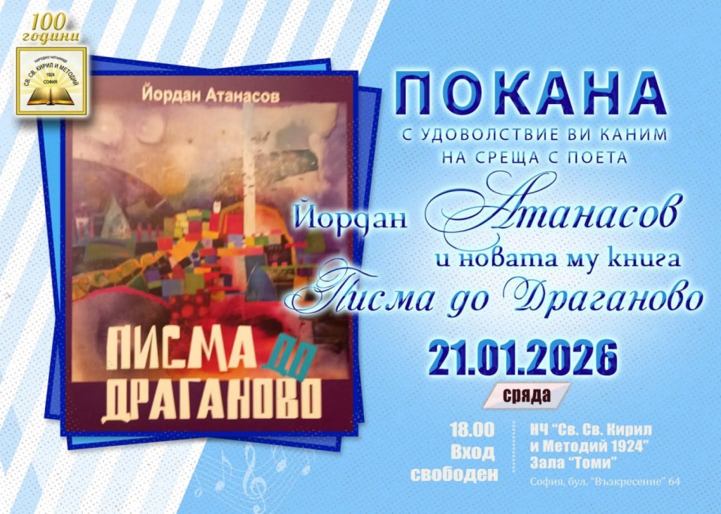 НЧ „Св. св. Кирил и Методий – 1924“ организира среща с поета Йордан Атанасов и представяне на най-новата му книга „Писма до Драганово“.