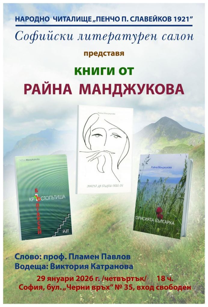 Софийският литературен салон към НЧ „Пенчо П. Славейков 1921“ кани почитателите на съвременната българска литература на среща с творчеството на Райна Манджукова – автор с разпознаваем глас и чувствителен поглед към човешката и националната съдба.