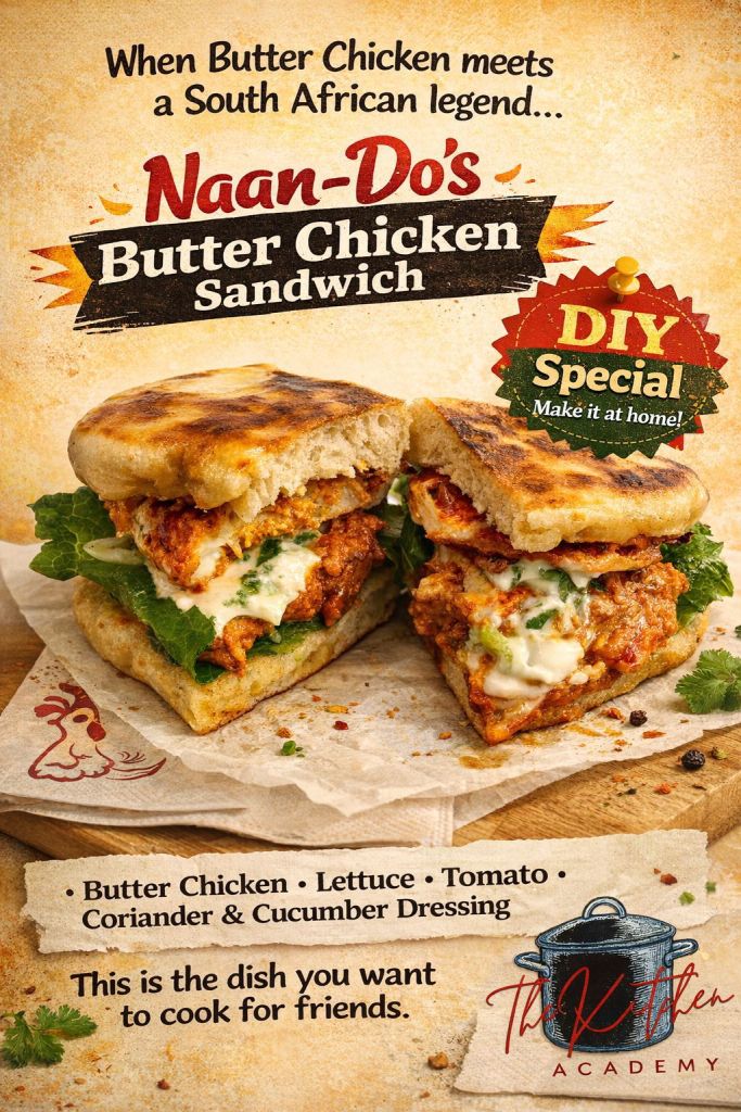 Inspired by decades of brilliant, cheeky advertising from South Africa’s most famous chicken brand, this is a playful home-kitchen homage: the Butter Chicken Naan-Do Sandwich.