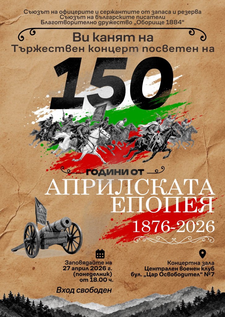 На 27 април 2026 г. (понеделник) от 18:00 ч. в Концертната зала на Централния военен клуб в София ще се състои тържествен концерт, посветен на 150-годишнината от Априлското въстание (1876–2026).