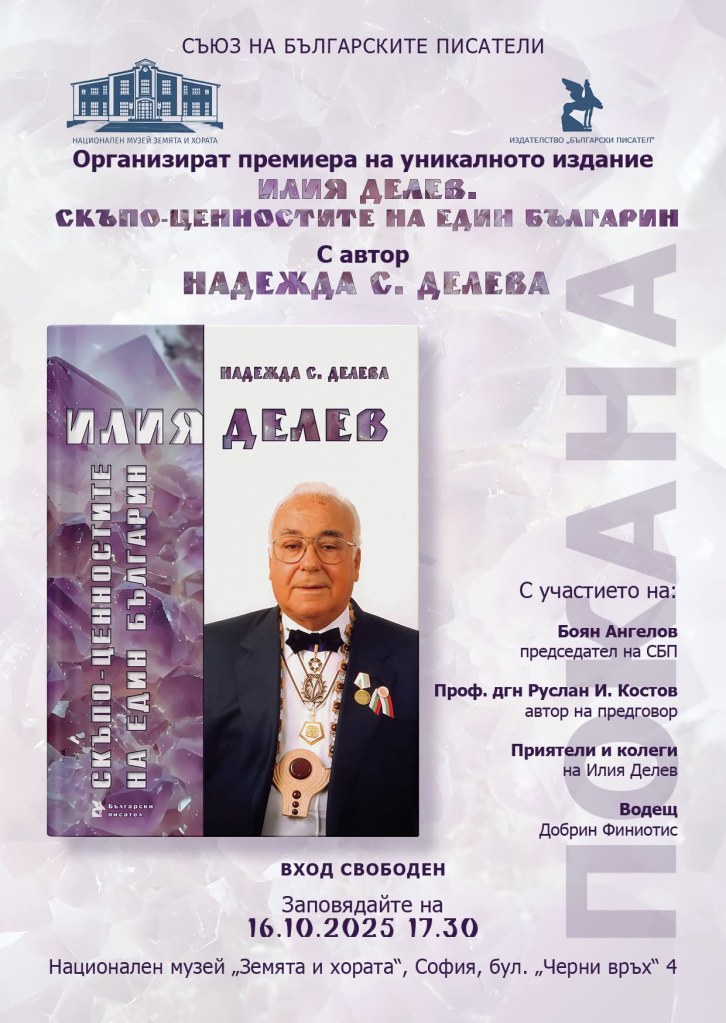 Съюзът на българските писатели и Националният музей „Земята и хората“ организират тържествена премиера на книгата „Илия Делев Скъпо-ценностите на един българин“ с автор Надежда С. Делeва.