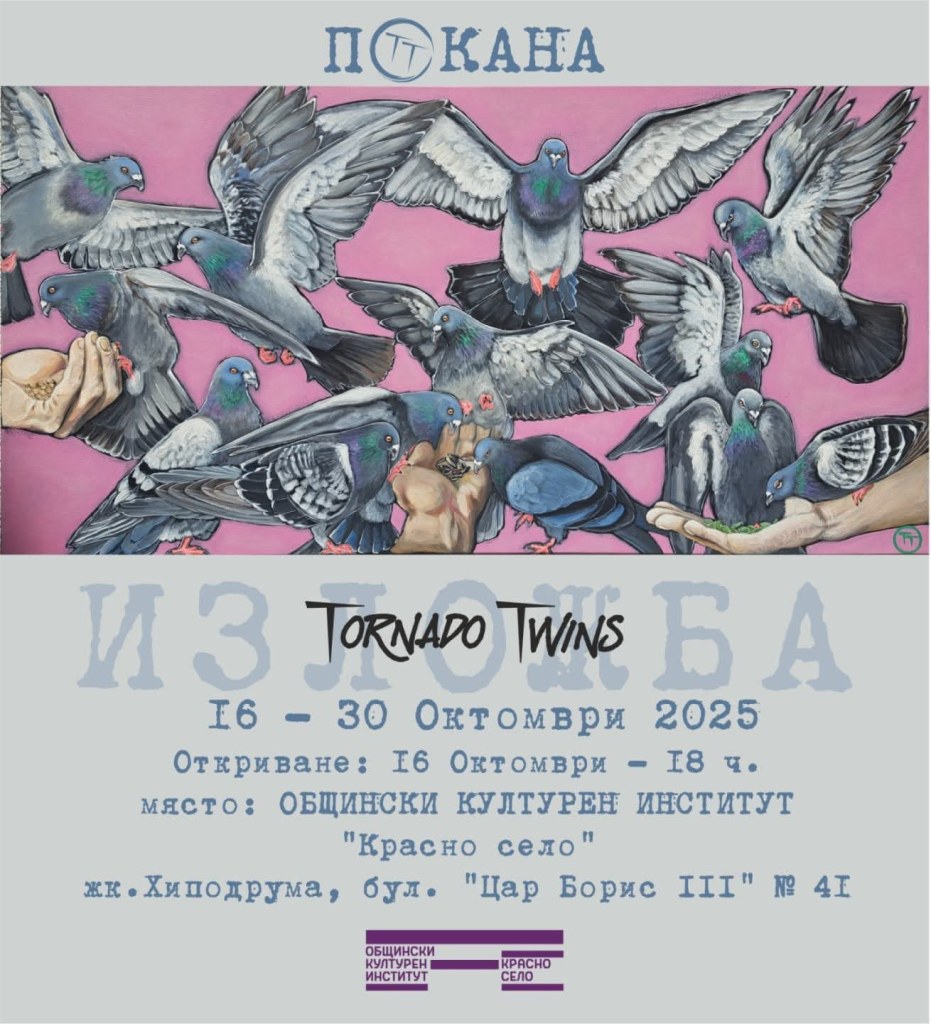 На 16 октомври (четвъртък) от 18:00 ч. в ОКИ „Красно село“ (ж.к. Хиподрума, бул. „Цар Борис III“ №41) ще бъде открита новата изложба на Tornado Twins – арт дуо, което превръща всяко платно в експлозия от светлина и настроение.