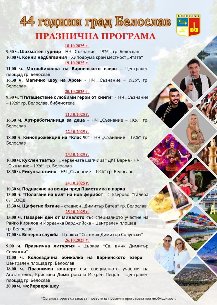 Град Белослав ще отбележи своя 44-ти рожден ден с цяла седмица от празнични събития, които ще съберат жители и гости на общината от 18 до 26 октомври 2025 г.