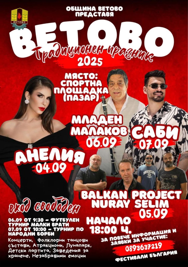 От 4 до 7 септември на спортната площадка в центъра на Ветово ще се проведе Традиционният празник „Ветово 2025“.
