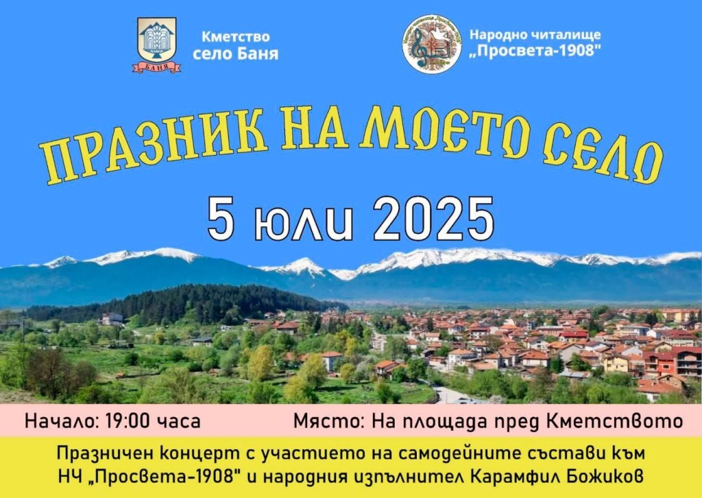 Село Баня, разположено в подножието на величествената Пирин планина, ще се превърне в сцена на радост и традиции на 5 юли 2025 г., когато ще се проведе „Празник на моето село“ – едно от най-очакваните събития в региона.