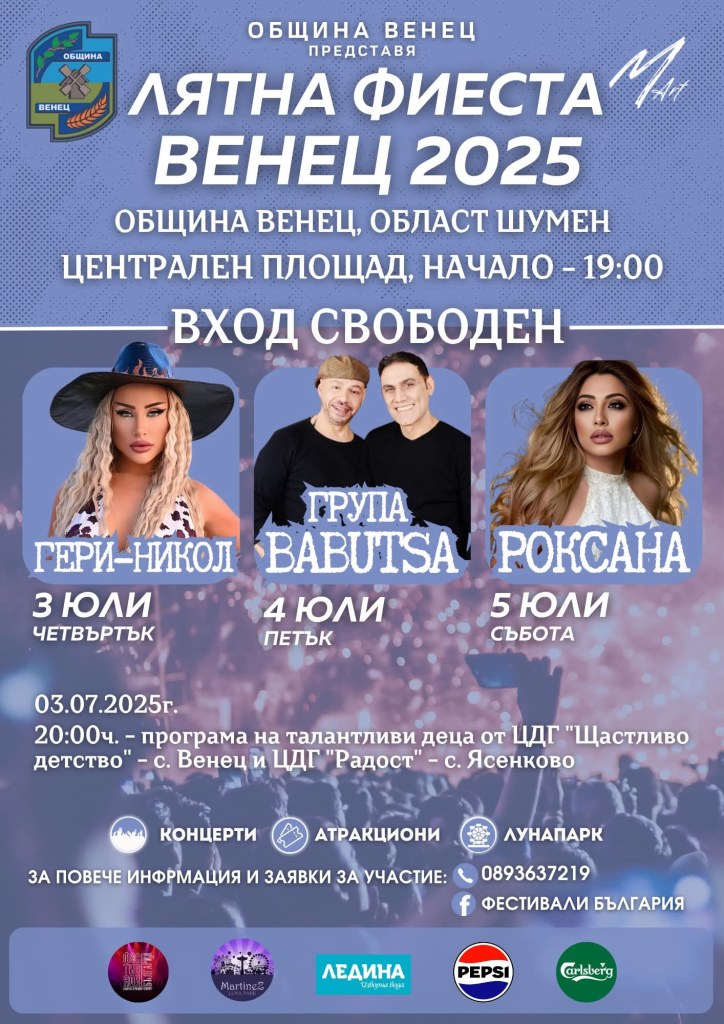 Община Венец, област Шумен, кани всички жители и гости на региона на Лятна Фиеста Венец 2025 на тридневен празник с музика, атракциони и незабравими емоции.