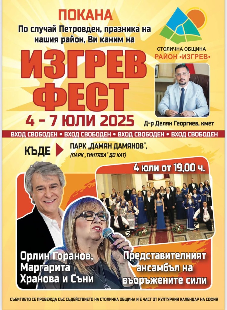 По повод Петровден – празника на район „Изгрев“, Столична община и районната администрация канят всички жители и гости на столицата на ИЗГРЕВ ФЕСТ 2025, който ще се проведе от 4 до 7 юли в парк „Дамян Дамянов“ (познат още като парк „Тинтява“, до КАТ).