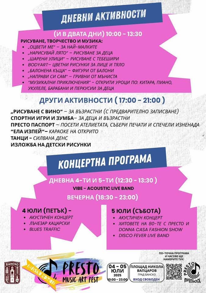 Два дни музика, ателиета, концерти и творчество на площада в Банско! PRESTO MUSIC ART FEST – BANSKO EDITION събира малки и големи на 4 и 5 юли 2025 с вход свободен.