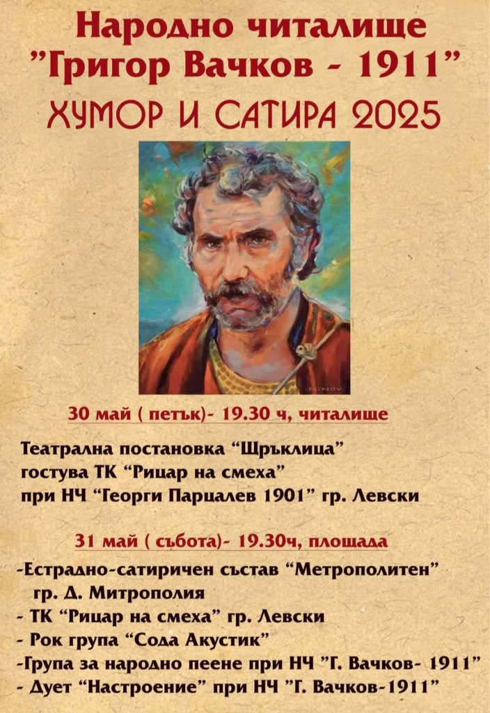 На 30 и 31 май 2025 г. Народно читалище „Григор Вачков – 1911“ ще бъде домакин на културния фестивал „Хумор и сатира 2025“, посветен на смеха, театъра и музиката.