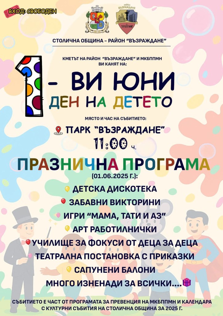 На най-вълшебния ден от годината – Деня на детето – Столична община, район „Възраждане“ кани малчуганите и техните семейства на незабравим празник в парк „Възраждане“. Началото е точно в 11:00 ч., а входът е свободен!