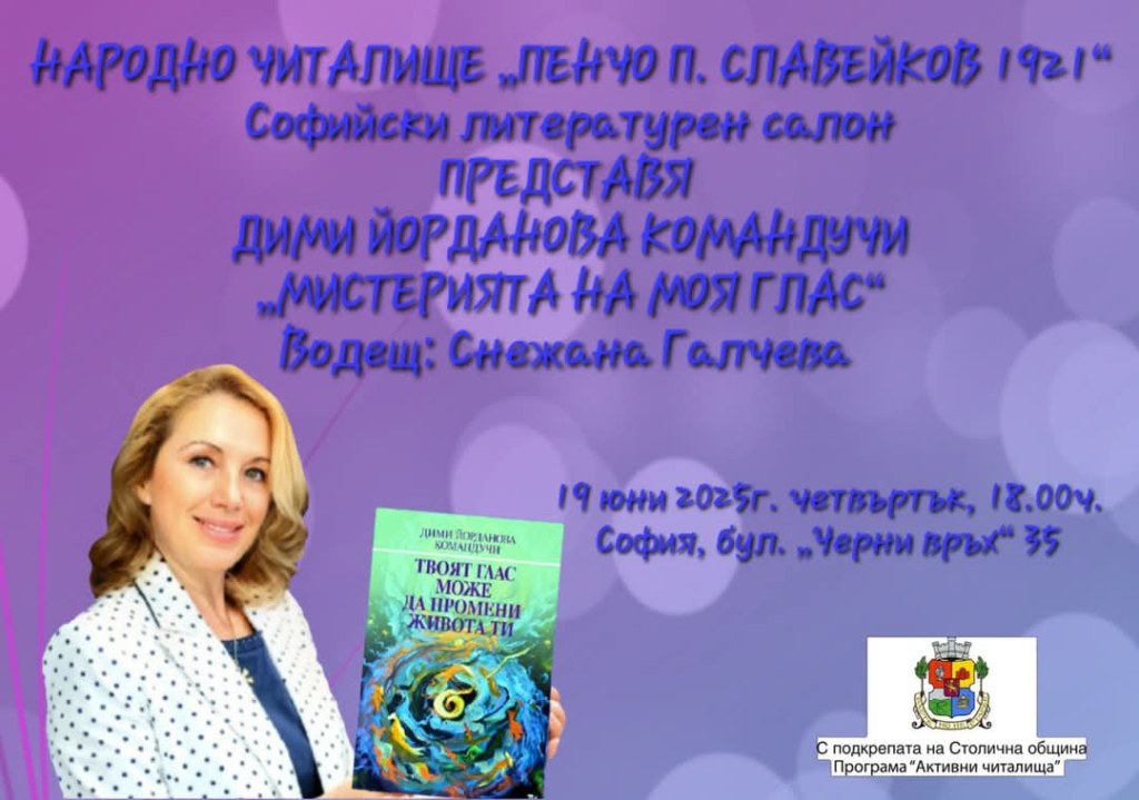 На 19 юни 2025 г., в 18:00 ч., Народно читалище „Пенчо П. Славейков 1921“ отваря вратите на своя Софийски литературен салон за едно специално събитие, посветено на силата на гласа и личната трансформация.