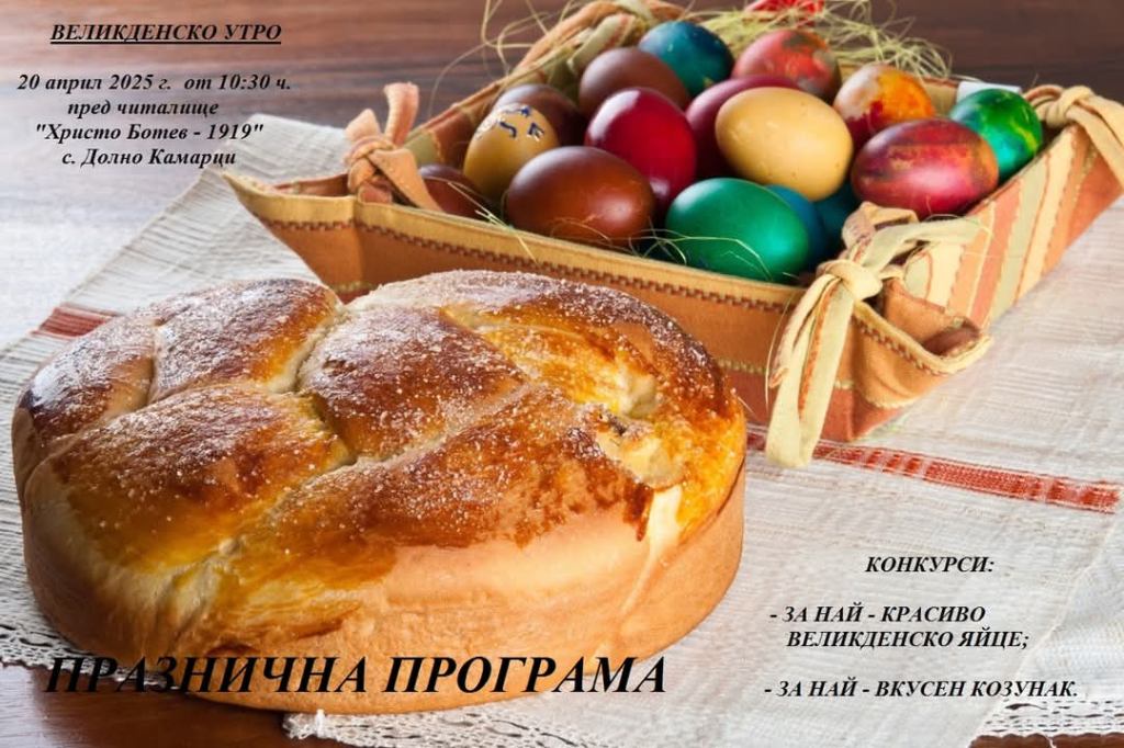 На 20 април 2025 г. от 10:30 ч. пред Народно читалище „Христо Ботев – 1919“ в село Долно Камарци ще се състои традиционното „Великденско утро“ – събитие, което събира малки и големи около празничната трапеза, шарените яйца и аромата на домашен козунак.