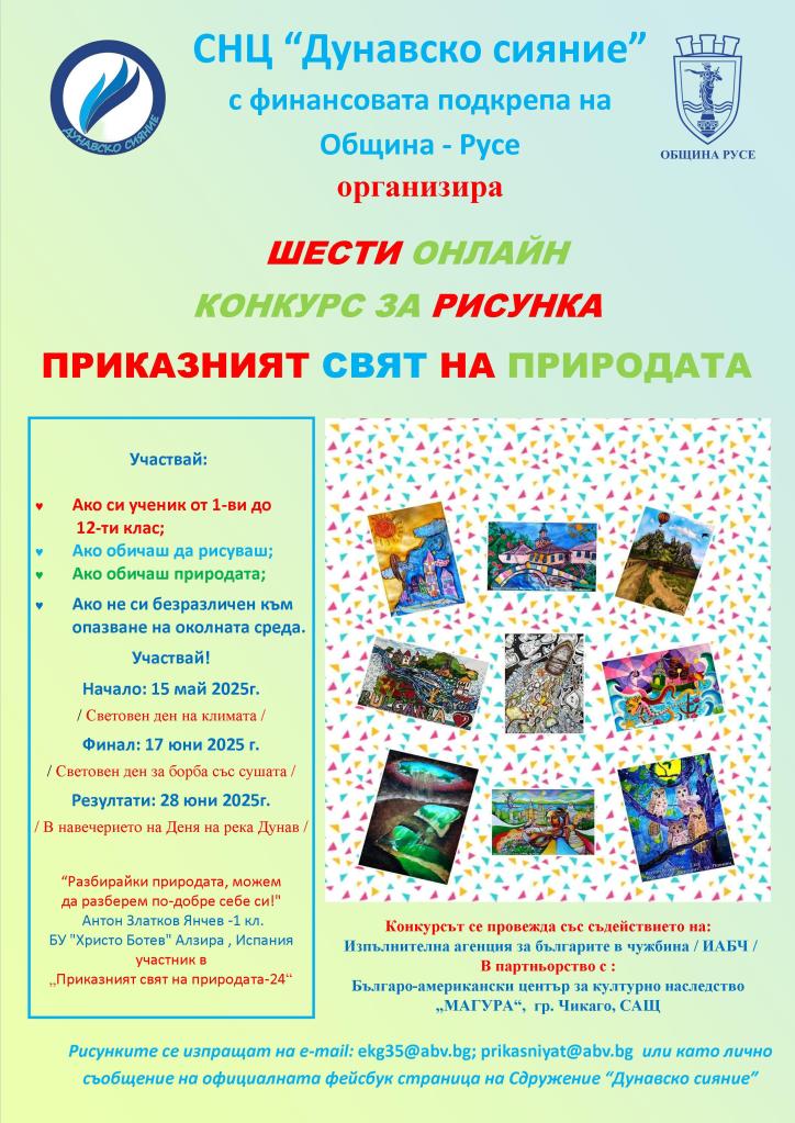 От 15 май 2025 г. /Световния ден на климата/, стартира Шестото издание на онлайн екоарт конкурс за рисунка „Приказният свят на природата“.