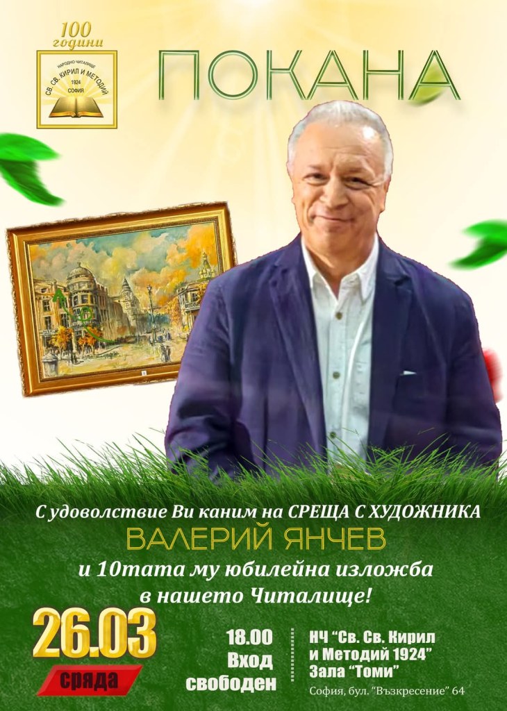 На 26 март (сряда) от 18:00 ч. в Народно читалище „Св. Св. Кирил и Методий 1924“ ще се проведе среща с художника Валерий Янчев, който ще представи своята 10-та юбилейна изложба.