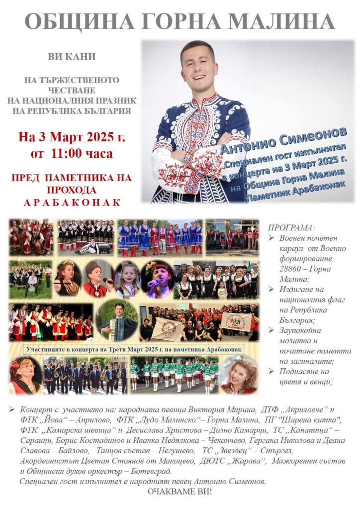 Община Горна Малина организира тържествено честване на Националния празник на Република България – Трети март. Събитието ще се проведе на 3 март 2025 г. от 11:00 часа пред паметника на прохода Арабаконак.