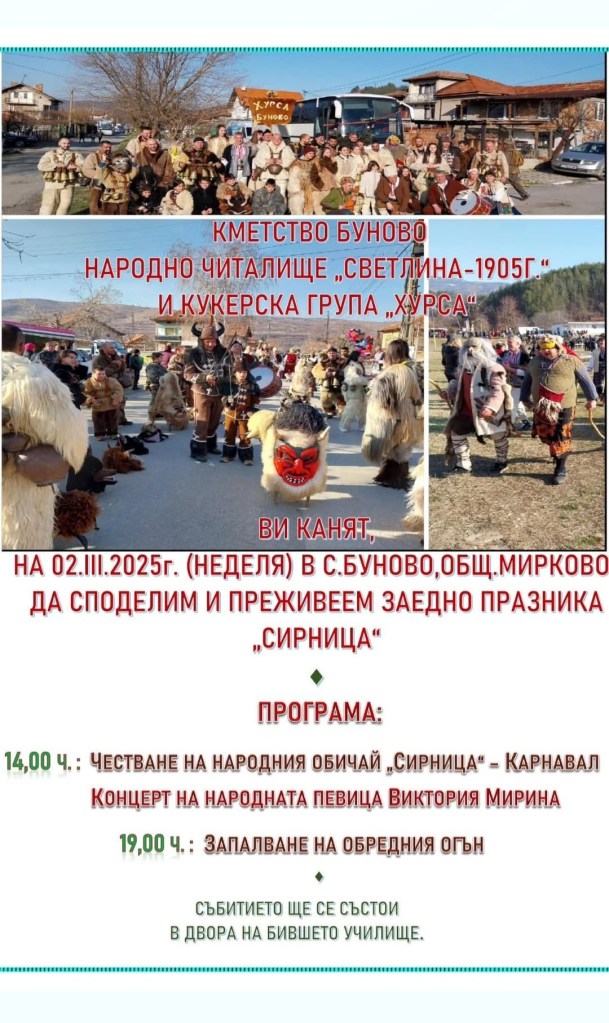 Село Буново, община Мирково, ще отпразнува традиционния народен обичай „Сирница“ на 2 март 2025 г. (неделя).