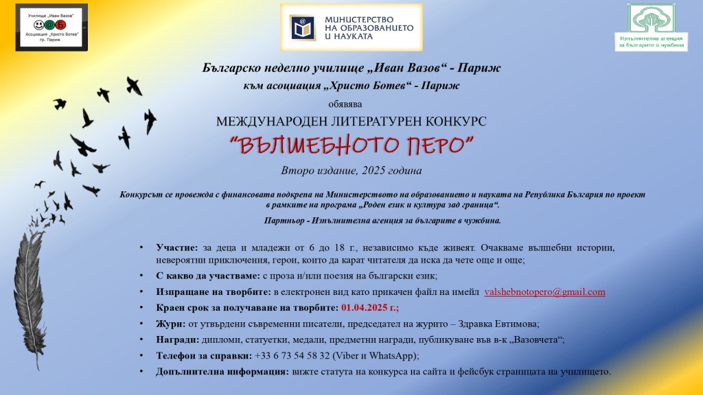 С голямо удоволствие ви съобщаваме, че Българско училище „Иван Вазов“ – Париж към Асоциация „Христо Ботев“ – Париж организира второ издание на Международния литературен конкурс „Вълшебното перо“.