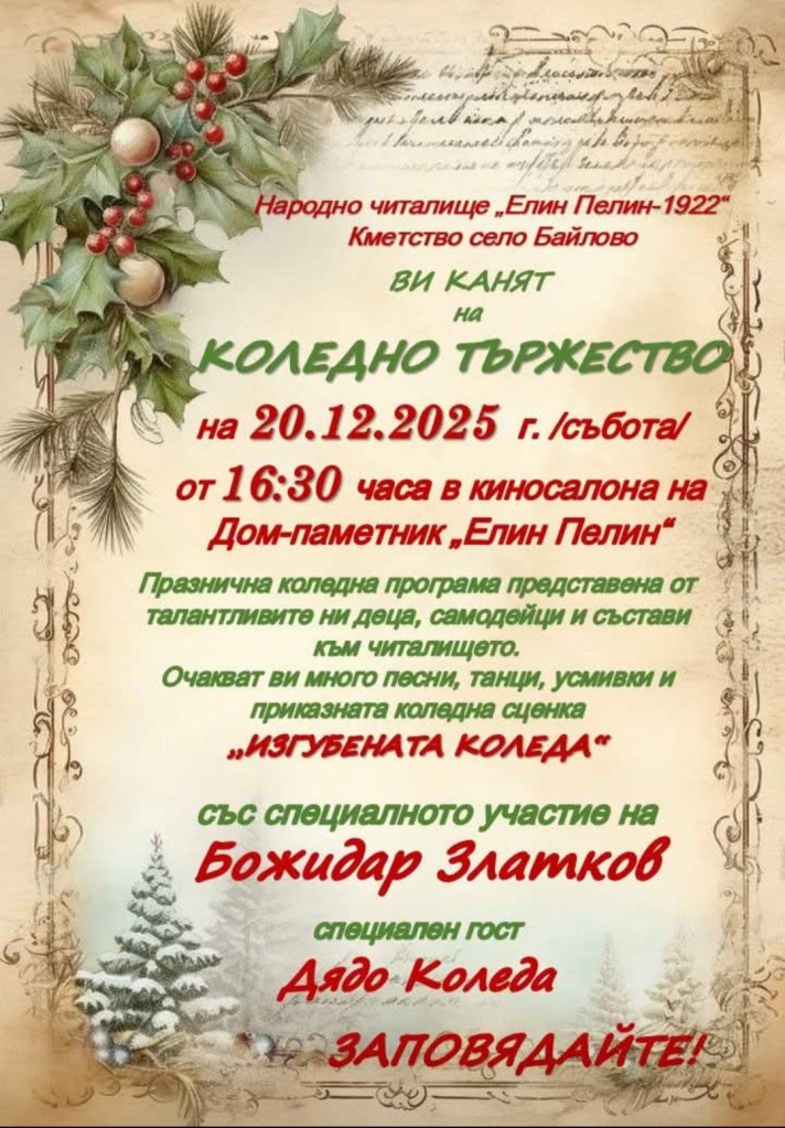 Народно читалище „Елин Пелин – 1922“ и Кметство село Байлово канят всички жители и гости на селото на празнично коледно тържество.