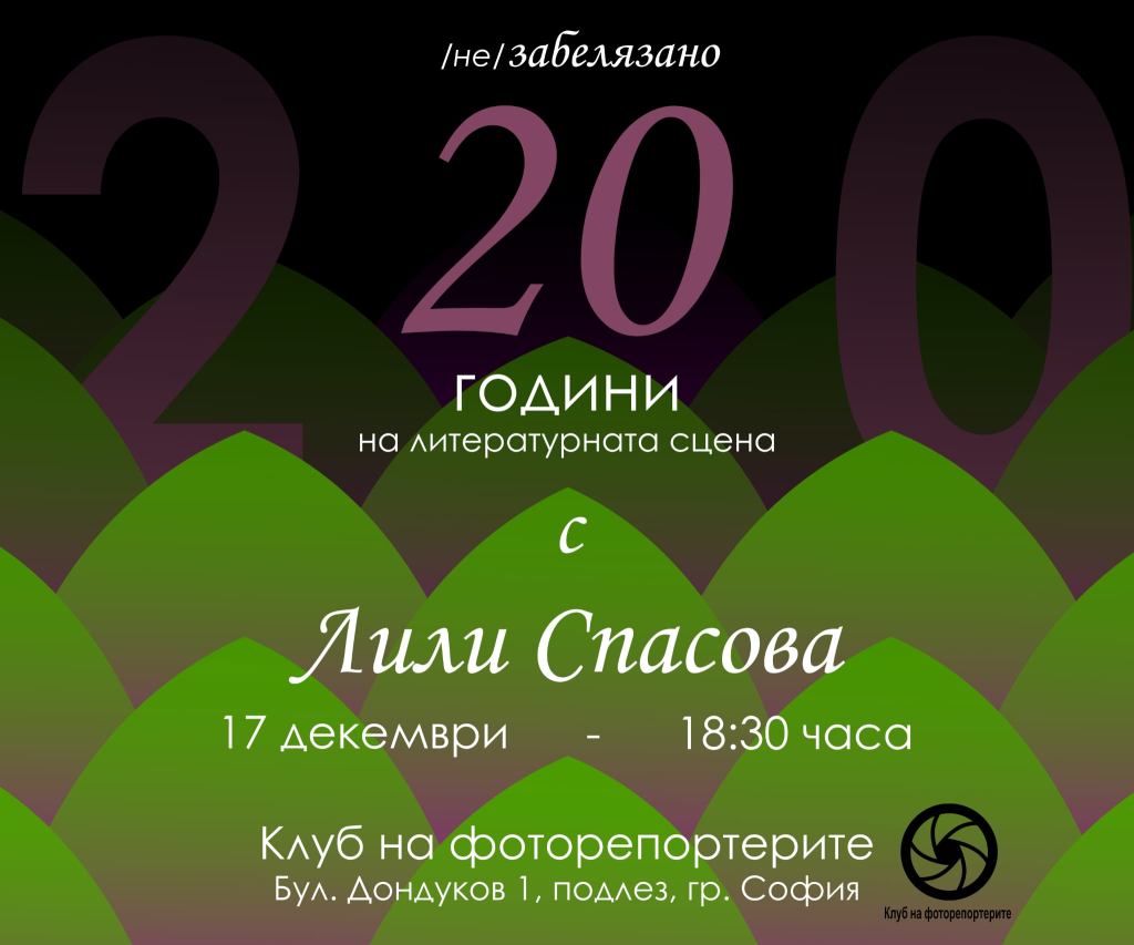 На 17 декември в Клуба на фоторепортера в София ще се проведе празнично събитие, посветено на 20-годишнината от издаването на първата поетична книга на обичаната писателка Лили Спасова.
