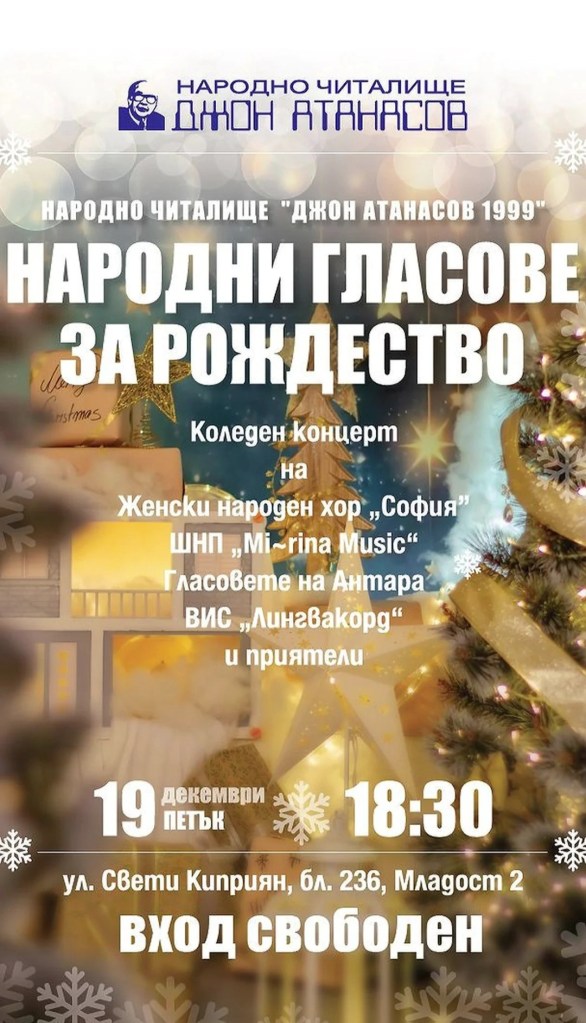 На 19 декември (петък) от 18:30 ч. Народно читалище „Джон Атанасов 1999“ кани софиянци и гости на столицата на празничен коледен концерт под надслов „Народни гласове за Рождество“.