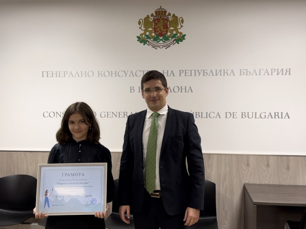 В конкурса за детско авторско видео „Bulgaria a través de mis ojos“ на специална церемония в Генералното консулство на Република България в Барселона, консулът Илиян Вълков връчи наградата на победителя Алекса Милкова.