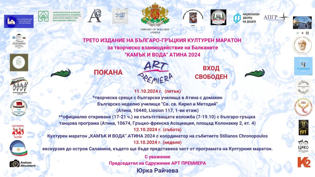 Сдружение „АРТ ПРЕМИЕРА“ под егида на Посолството на Република България в Атина и Изпълнителна агенция за българите в чужбина в сътрудничество с гръцката организация „Sta chromata tis paradosis“ – Атина и домакинството на Българско неделно училище „Св. св. Кирил и Методий“ – Атина има удоволствието да ви покани на Третото издание на Българо – Гръцкия културен маратон за творческо взаимодействие на Балканите „КАМЪК И ВОДА“ АТИНА 2024.