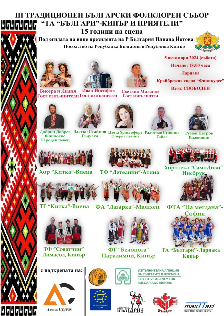 Трети традиционен български фолклорен събор „Танцов ансамбъл “Българи“-Кипър и приятели“ се представя на открита сцена, на централната крайбрежна улица в гр. Ларнака, Кипър. Достъпът е свободен, както и няма възрастови ограничения за публиката.