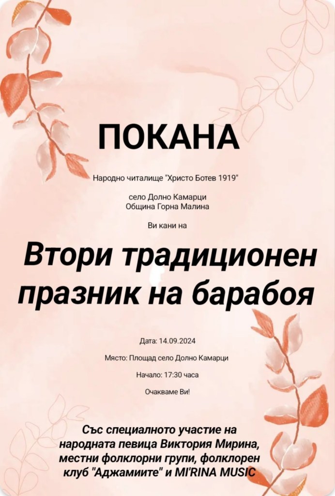 Днес точно в 17:30 часа бъдете част от най-вълнуващото събитие, което ще се проведе на площада в село Долно Камарци за втора поредна година – „Празник на барабоя“ 2024.