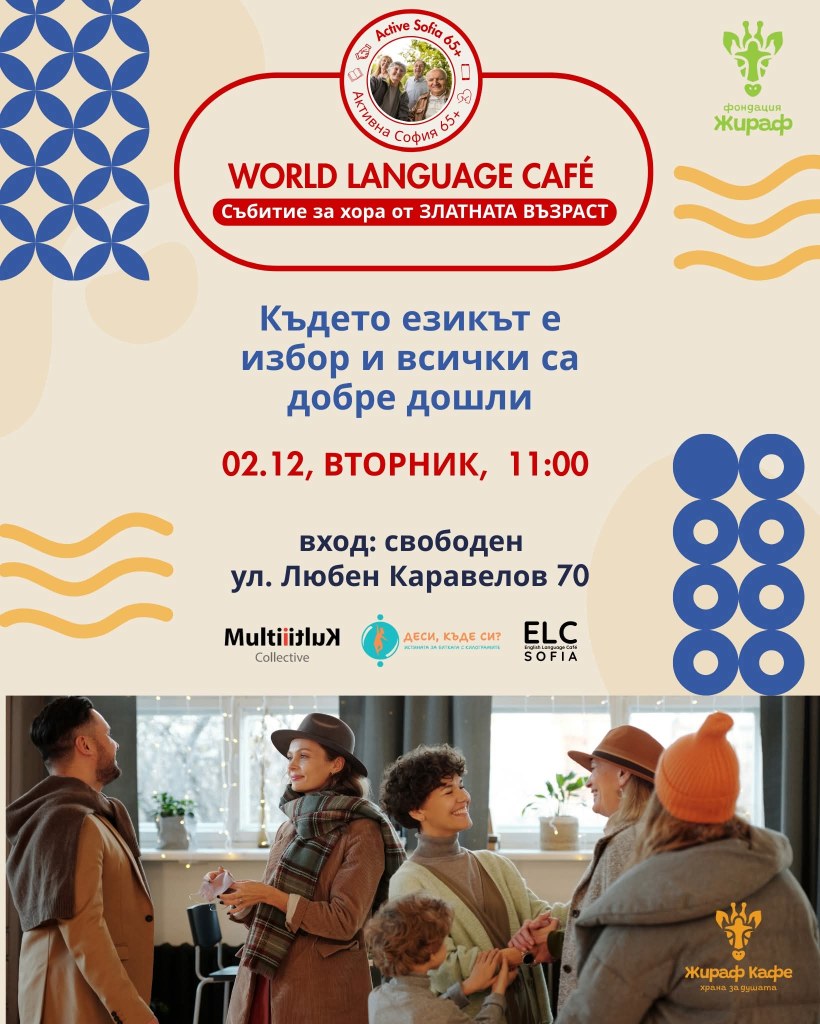 Ако обичате езиците, новите запознанства и вдъхновяващите разговори, то на 2 декември 2025 г. в уютната атмосфера на Жираф Кафе предстои едно специално събитие за софиянци 60+ – World Language Café, организирано от инициативата „Активна София 65+“.