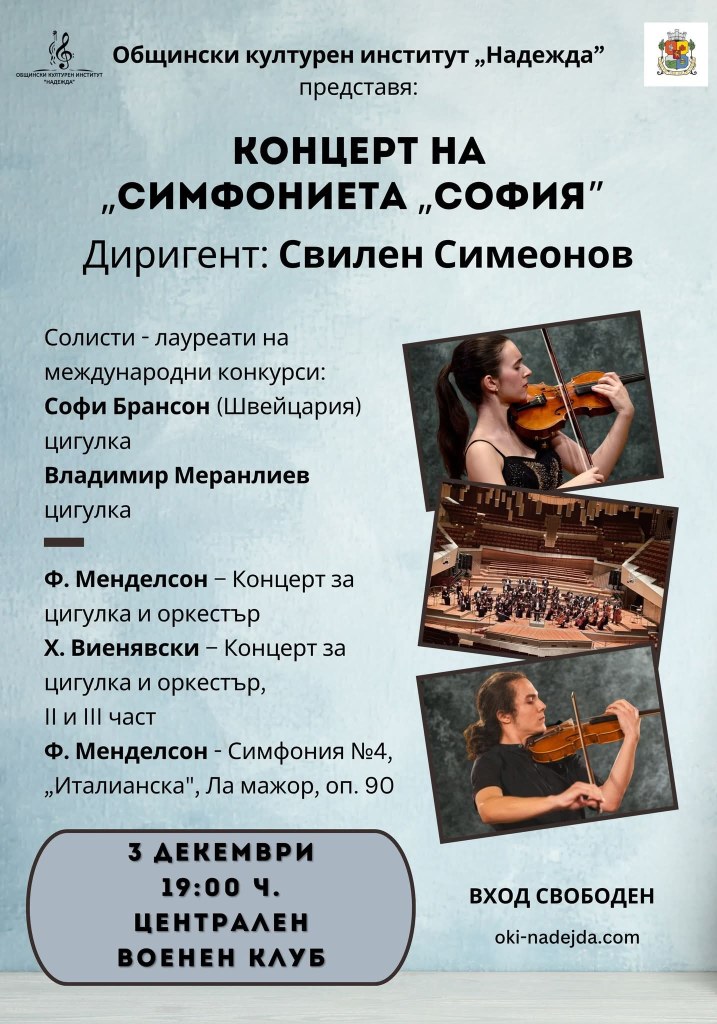 Общински културен институт „Надежда“ организира празничен концерт на „Симфониета София“, който ще се състои на 3 декември от 19:00 ч. в Централния военен клуб.