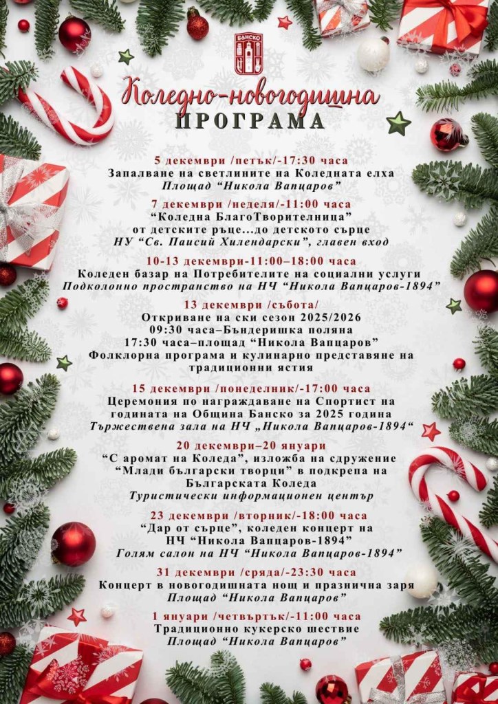 Банско официално обяви богатата си празнична програма, която ще внесе коледен дух и зимно настроение в града от началото на декември до първите дни на новата година.
