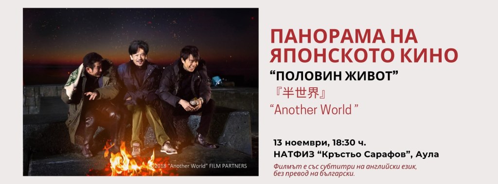 На 13 ноември (четвъртък) от 18:30 ч. в Аулата на НАТФИЗ „Кръстьо Сарафов“ на ул. „Стефан Караджа“ 20 в София се открива програмата „Панорама на японското кино“ с прожекция на японския филм „Полoвин живот“ / 半世界 “Another World” с режисьор Джунджи Сакамото, Япония, 2019 г., 120 мин..